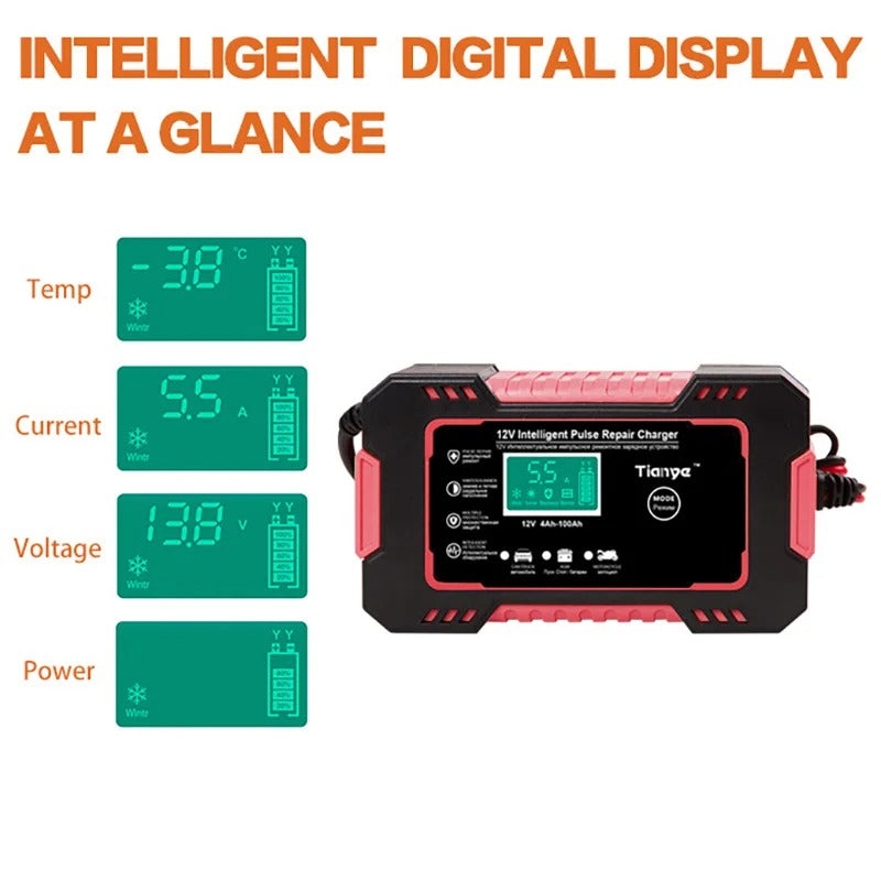 12V 6A Cargador de batería , Pantalla LCD Cargadores de reparación de pulso de energía Ácido de plomo seco húmedoTamaño:(L × W × H): 150 × 85 × 62mmVoltaje: 12VTipos de baterías: La mayoría de los tipos de baterías de plomo ácido, incluyendo calcio, y AGM GEL, húmedo, EFB, etc.Detección de voltaje: SíTecnología Switchmode: SíProtección de polaridad: SíProtección corta de salida: SíProtección sin enlace de batería: SíProtección contra sobretensión: SíProtección contra sobretemperatura: SíRefrigeración: ventiladorVoltaje de entrada: CA 110-220V, 50-60HzVoltaje mínimo de arranque: 8,0 VRango de batería: 4-100AhProtección térmica: 65'C +/-5'CEficiencia: App. 85%.Estándares de cumplimiento: CE,FCC,ROHS,CMACaracterísticas:-Controlado por microprocesador-Modo de interruptor automático profesional-Para cargar baterías AGM,GEL,SLA y Wet-Pantalla LCD y carga de reparación de pulso-Protección contra sobrecalentamiento, sobrecarga, cortocircuito y polaridad inversa-Maximiza la duración de la bateríaEl paquete incluye1 cargador inteligente de 12V 6A1 x Manual