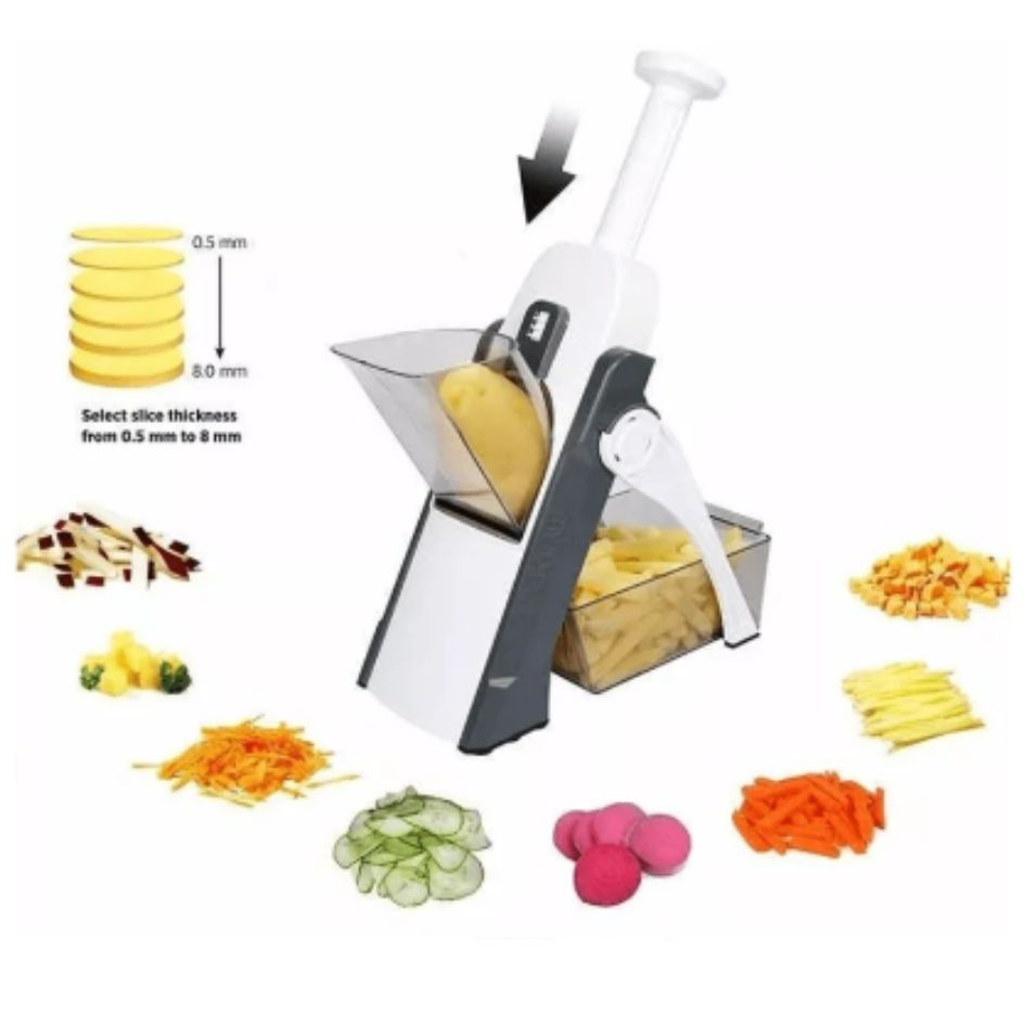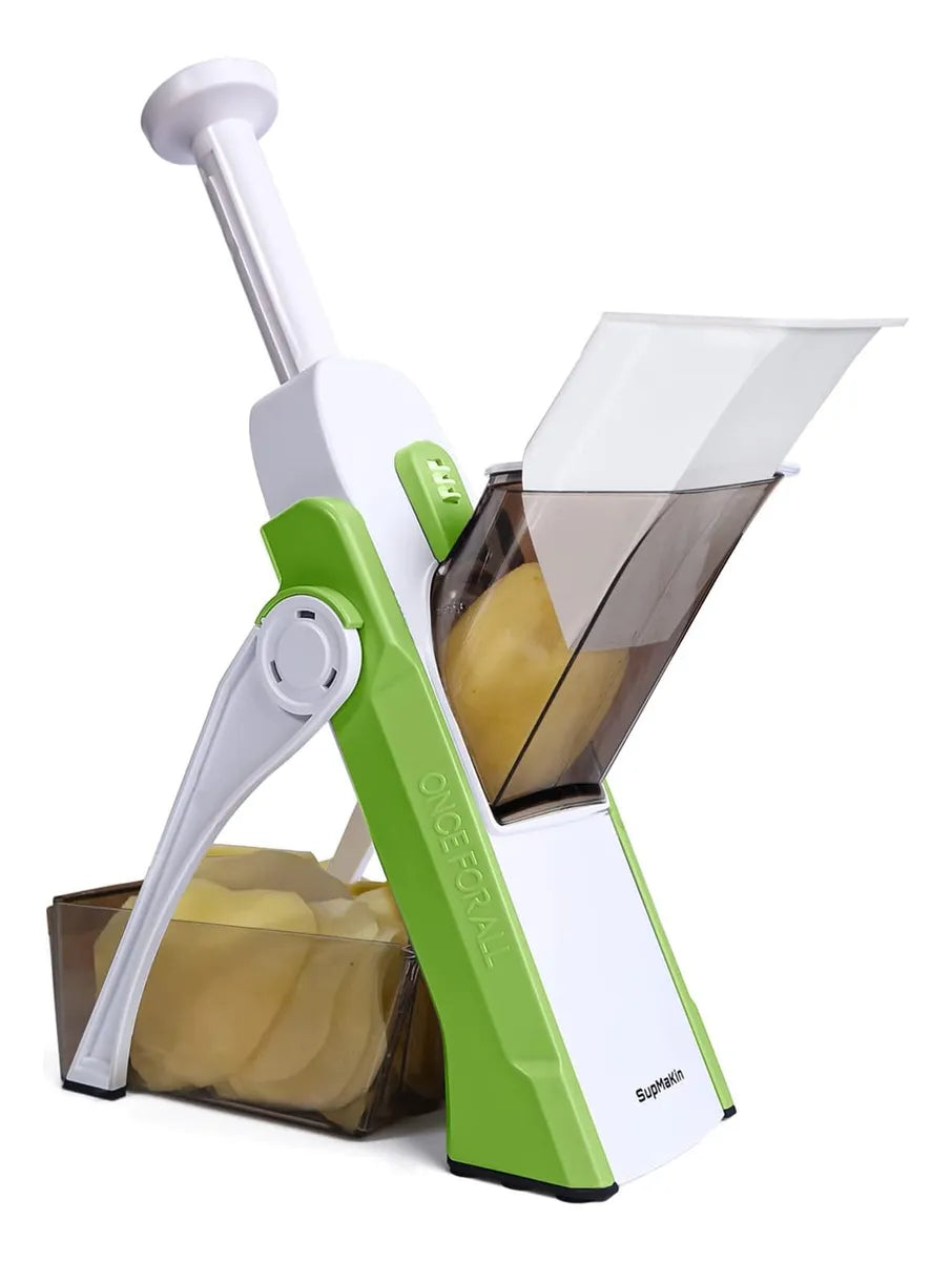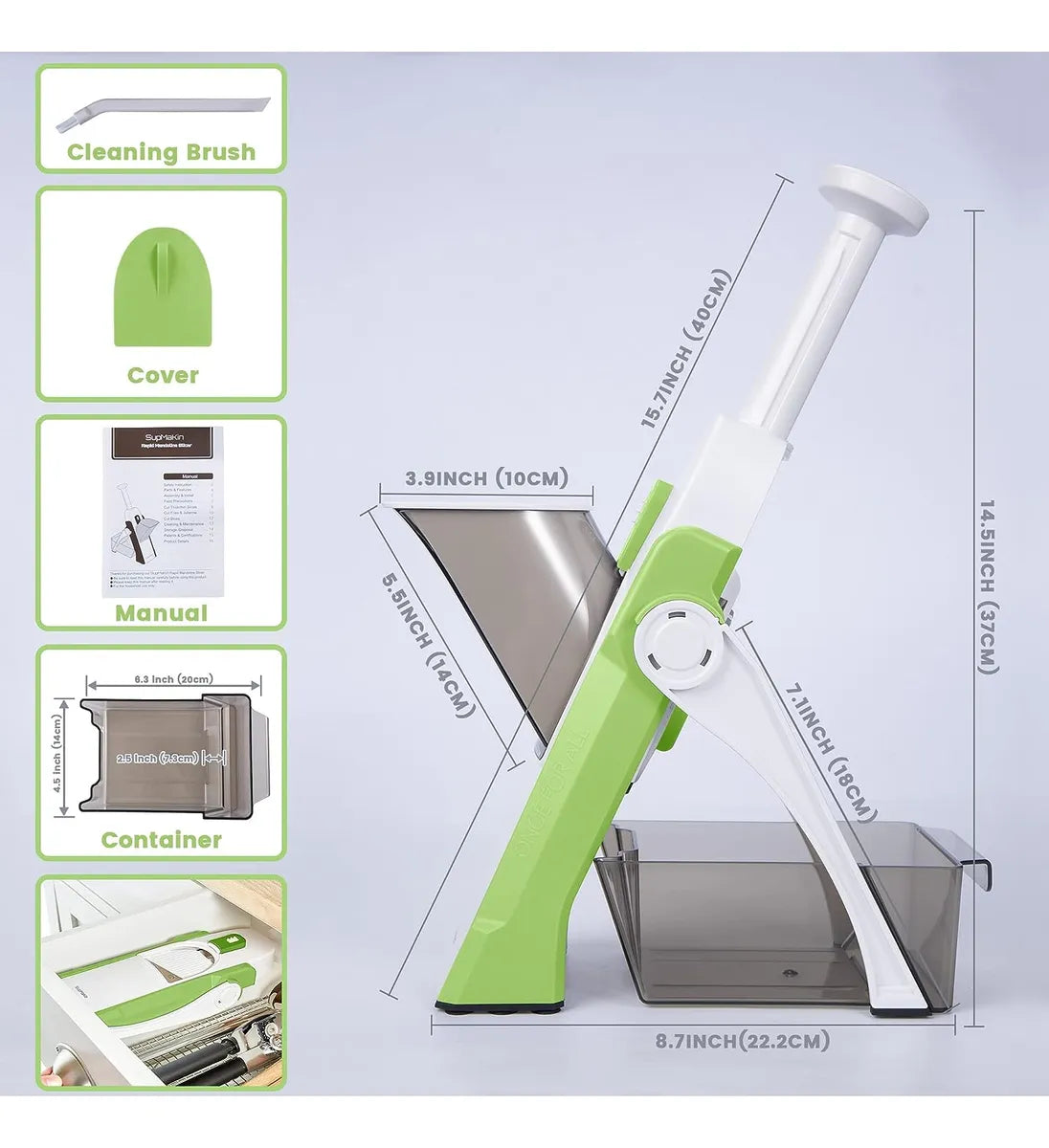 CORTADOR VERTICAL DE VERDURAS Caracteristicas:Cortador más seguro: en comparación con el cortador de verduras tradicional, este cortador vertical es más fácil y seguro de usar, lo que elimina el problema del reemplazo de la cuchilla y los riesgos de seguridad. Multifuncional 4 en 1: este cortador de verduras tiene cuatro modos de corte para elegir: cortar, rallar, cerilla, sin necesidad de cambiar la cuchilla, muy práctico. Hoja de acero inoxidable: la hoja delEl cortador de verduras está hecho de acero inoxidable apto para uso alimentario, por lo que que es más duradero, no se oxida, se limpia más cómodamente, se garantiza la higiene de los alimentos. Fácil almacenamiento y limpieza: diseño de cortador de verduras plegable, compacto, de pequeño volumen, ocupa un pequeño espacio en el armario.La cuchara incluida puede eliminar fácilmente la suciedad del cortador de verduras y el recipiente es fácil de limpiar. Imprescindible en la cocina: picar verduras y frutas es fácil y seguro con este cortador de verduras, que es ideal para hacer patatas fritas y ensaladas y acelera el tiempo de preparación. Incluye:Cortador de Verduras y Accesorios Disponible en varios colores, LOS COLORES SE MANDAN AL AZAR.