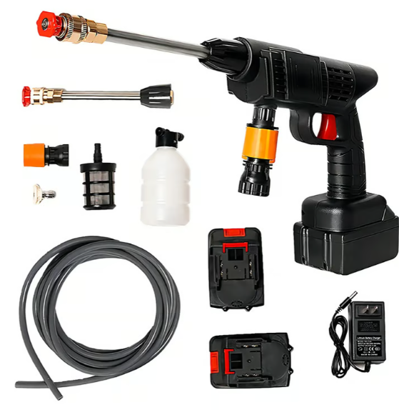 LAVADORA DE ALTA PRESIÓN PORTÁTIL INALÁMBRICALa lavadora de autos de alta presión portátil está diseñada para ofrecer un sistema de limpieza eficiente, autónomo y de alto rendimiento, ideal para el mantenimiento de vehículos, motocicletas, bicicletas y superficies domésticas. Su estructura compacta y su diseño inalámbrico facilitan su transporte y operación en entornos sin acceso directo a fuentes de agua o energía eléctrica. Especificaciones TécnicasCategoría del producto Lavadora de alta presión inalámbrica portátilMaterial del cuerpo Plástico de ingeniería (ABS de alta resistencia)Material de la boquilla/pistola Aleación metálica anticorrosivaMaterial del cubo Tela Oxford + plástico PPPresión de salida 3 MPaPotencia del motor 200 W Distancia de pulverización 8–10 metrosTiempo de carga Aproximadamente 4 horasFuente de energía Batería recargable de litio (uso inalámbrico)Modos de salida de agua Línea recta / patrón en abanicoUso inalámbrico SíColor NegroModelos compatibles UniversalesComponentes IncluidosLavadora de alta presión portátilCaja de almacenamiento rígidaCaracterísticas Técnicas Destacadas Construcción y materialesFabricada con plásticos de ingeniería de alta resistencia y componentes metálicos de aleación, esta unidad ofrece alta durabilidad estructural y resistencia a la presión. El diseño del mango ergonómico y la base antideslizante permiten un manejo seguro y estable durante su operación. Sistema de pulverización ajustableEquipada con múltiples modos de pulverización, el usuario puede seleccionar entre chorro concentrado de alta presión para eliminación de suciedad adherida o modo de abanico para limpieza general y enjuague rápido. Compatible con botellas de espuma detergente, lo que optimiza la aplicación de agentes limpiadores. AplicacionesLavado de automóviles, motocicletas y bicicletas.Limpieza de fachadas, ventanas, terrazas y muros.Mantenimiento doméstico y limpieza de herramientas o mobiliario exterior.
