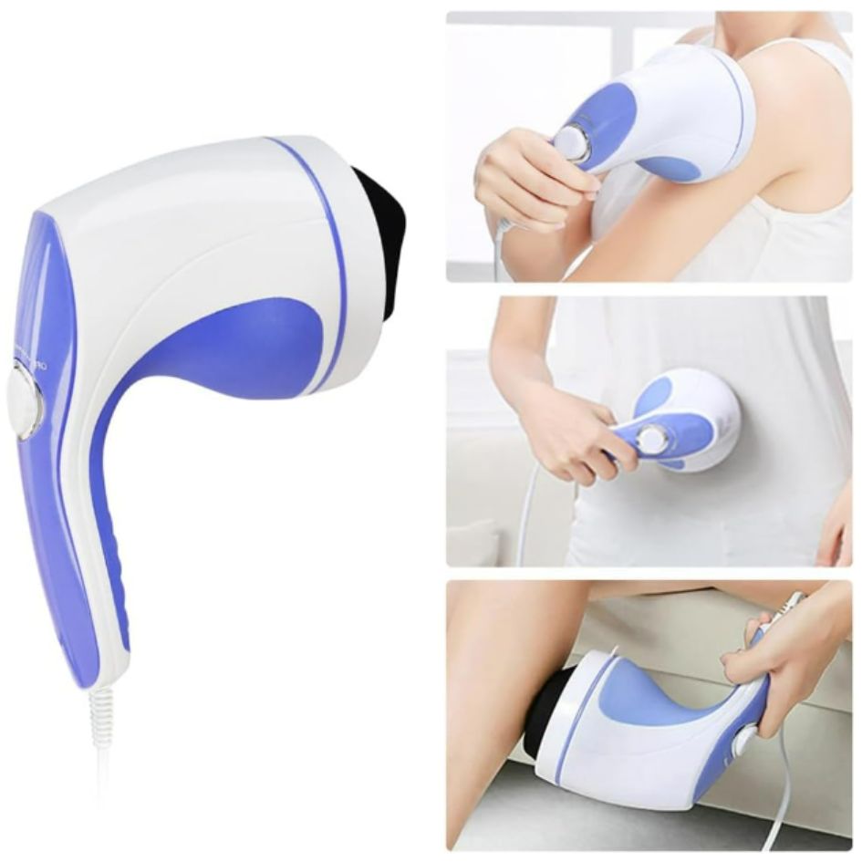 MASAJEADOR CORPORAL RELAX & TONE Caracteristicas:Relax and spinTone masajeador electrico esta equipado con cabezales intercambiables para obtener diferentes funciones, incluso cuenta con una perilla de control de intensidad que regula los movimientos y mediante el cual se puede disfrutar de un masaje mucho mas comodo, adaptable a los gustos personales y a alas nesecidades especificas de cada persona.Es ideal para hombres y mujeres, es ampliamente recomendado para liberar de las molestas contracturas, tensiones y lesiones musculares.Este util masajeador relax and tone tambien ayuda a quemar la grasa excedente de nuestro cuerpo,mejorala circulacion sanguinea, tonifica los musculos y la piel, brinda excelentes resultados en la remocion de asperezas y celulas muertas.Considerablemente ayuda en la reducción de pesoReduce la celulitis y mejora la apariencia de la piel.Mejora la circulación de la sangre, mejora de estiramiento muscular y dolor en las articulaciones.Incluye: Masajeador.Cabezal plano para masajes de espalda.Cabezal curvo.Cabezal con 8 esferas rotativas anatómicamente diseñadas.Cabezal de esponja